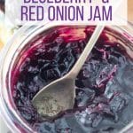 Savory blueberry and caramelized red onion jam is a decadent addition to your next burger or cheese board! Flavored with red wine, balsamic vinegar, and thyme, this jam a truly exceptional and complex topping to pair with meats and cheeses.