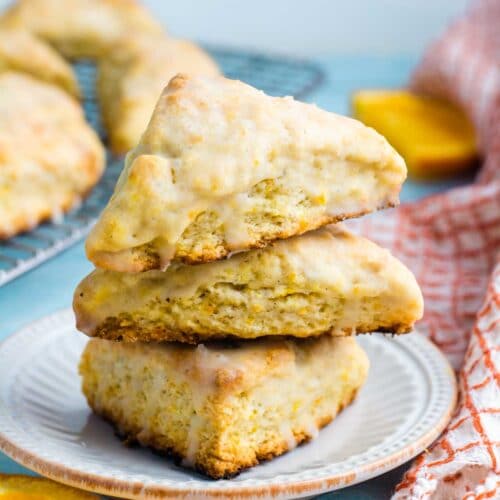 My absolute favorite scone recipe, these mini orange scones use fresh orange zest and an orange juice glaze for an absolutely addictive bakery-style treat. With hints of vanilla and cardamom spice, these easy scones are flaky-crumbly, moist, and come together in just 30 minutes with minimal effort! You’ll swear these are better than Panera!