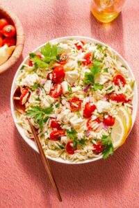 This lemon orzo salad with feta is an easy side dish that you can make with only 8 ingredients! It’s full of bright lemony flavor, from both lemon juice and lemon zest.