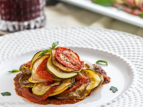 This classic dish of layered summer vegetables, including eggplant, squash, zucchini, and tomatoes, is as beautiful as it is delicious!