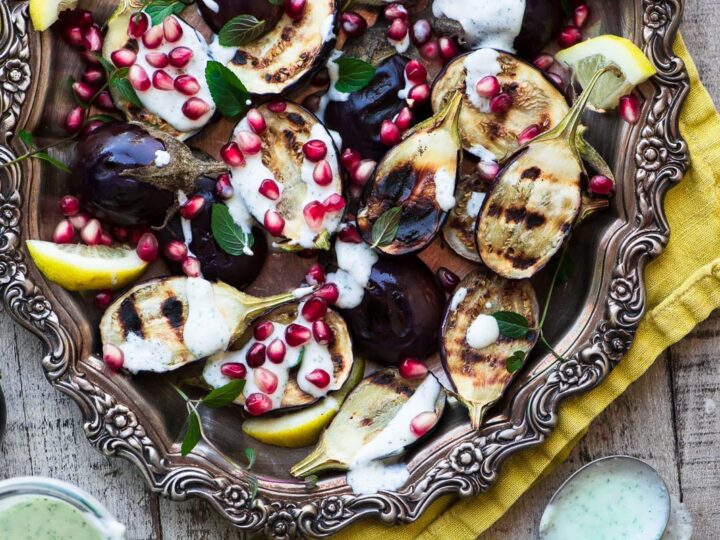 Grilled Baby Eggplant with Minted Yogurt and Pomegranate