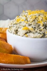 This hot baked spinach, artichoke, and crab dip is the perfect crowd-pleasing party dip — easy to make ahead, perfectly cheesy, and full of the good stuff. Making this in a crockpot keeps the dip hot and the oven free at your party!