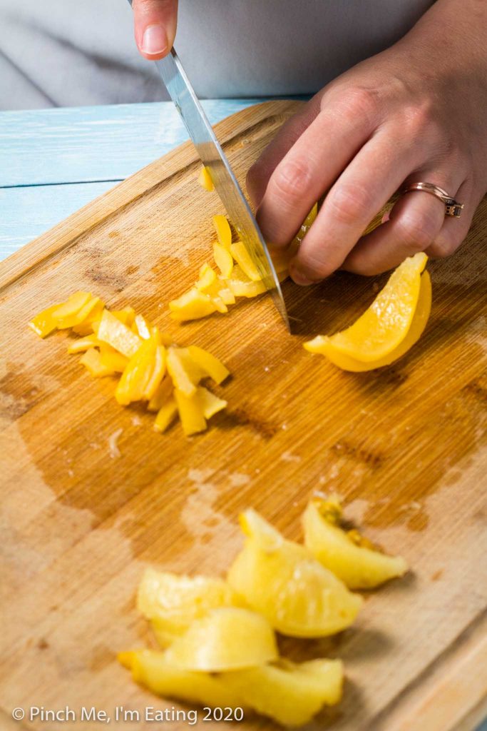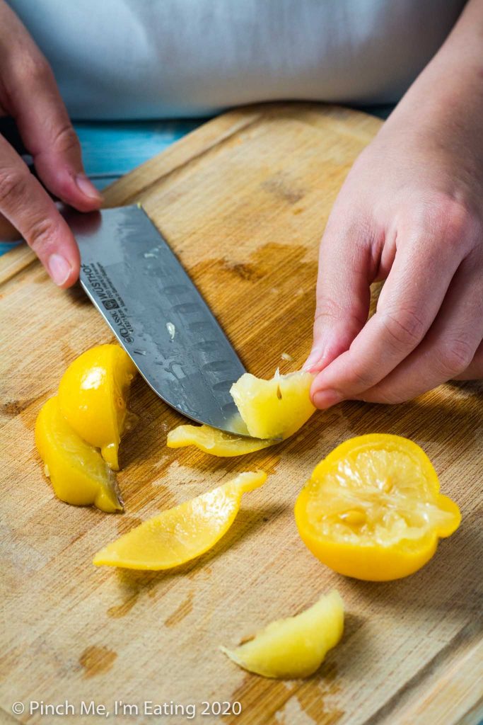 - To prepare the preserved lemon, first cut it into wedges. Remove the flesh from each wedge with a knife and discard. You will only be using the rind. Finely dice the rind and set aside.