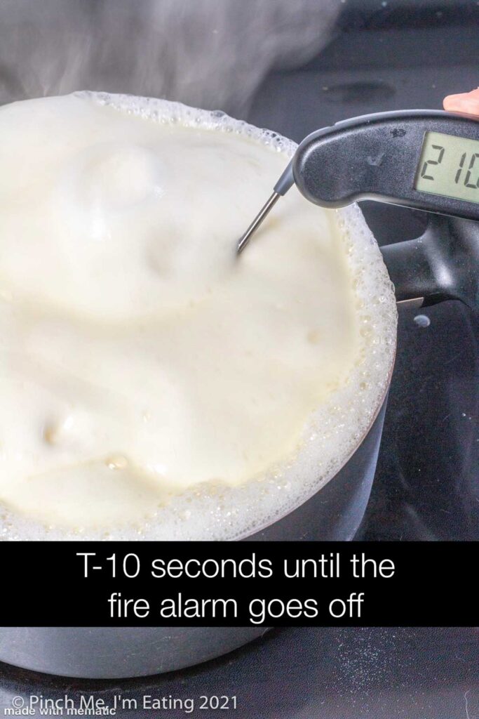 215 degrees: You’ll get to peak size and foaminess. It will be about quadrupled in size and is kind of fun to watch!