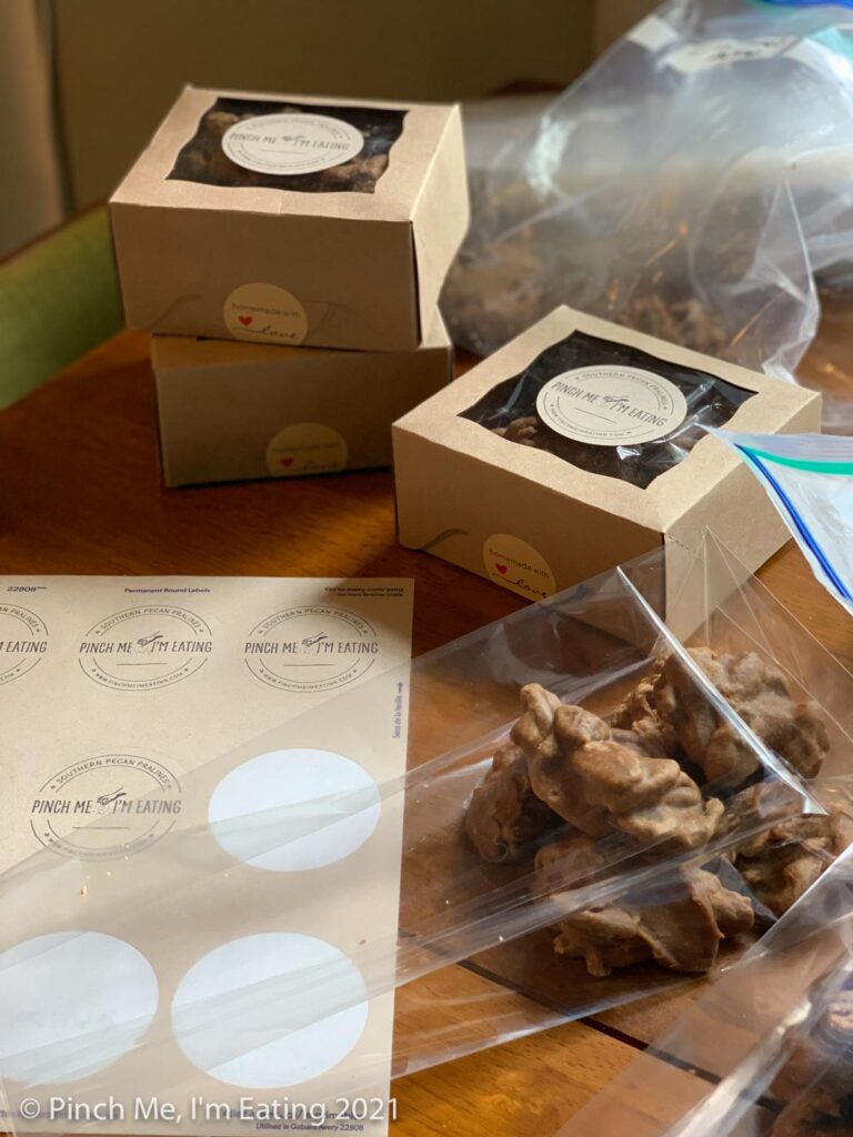 Here are the boxes, bags, and labels I used — each box fit 6-8 pralines inside.