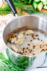 All you have to do is bring the brine and pickling spices to a boil (a mixture of vinegar, water, salt, sugar, garlic cloves, and a few whole spices) in a non-reactive saucepan.
